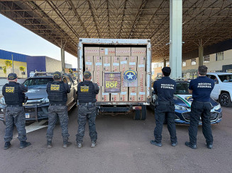 Policiais militares do DOF (Departamento de Operações de Fronteira) e agentes da Receita Federal apreenderam, nesta quarta-feira (22), na MS-386, um caminhão baú Iveco transportando cerca de 10 mil pacotes de cigarros contrabandeados do Paraguai. O veículo, segundo verificação, havia sido furtado em 2022 na cidade de Toledo, no Paraná.