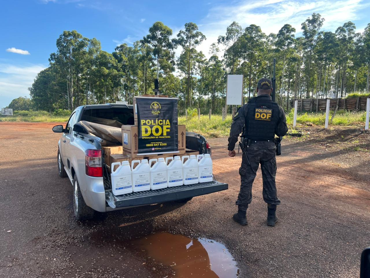 Durante a vistoria minuciosa no interior do carro, os agentes localizaram vários galões contendo defensivos agrícolas contrabandeados do Paraguai. Ao todo, foram apreendidos cerca de 250 litros dos produtos, cuja comercialização e transporte são proibidos sem autorização legal no território nacional.