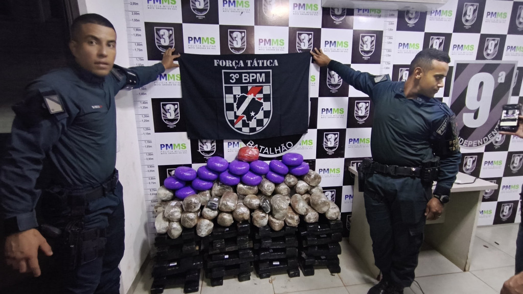 Com uso de uma lanterna a equipe acabou encontrando grande quantidade de maconha, acondicionada em sacos de lixo pretos e brancos, que após a pesagem, totalizou 90,1 quilos, além de 30,3 quilos da mesma droga em “buchas”, somando 120,4 quilos.