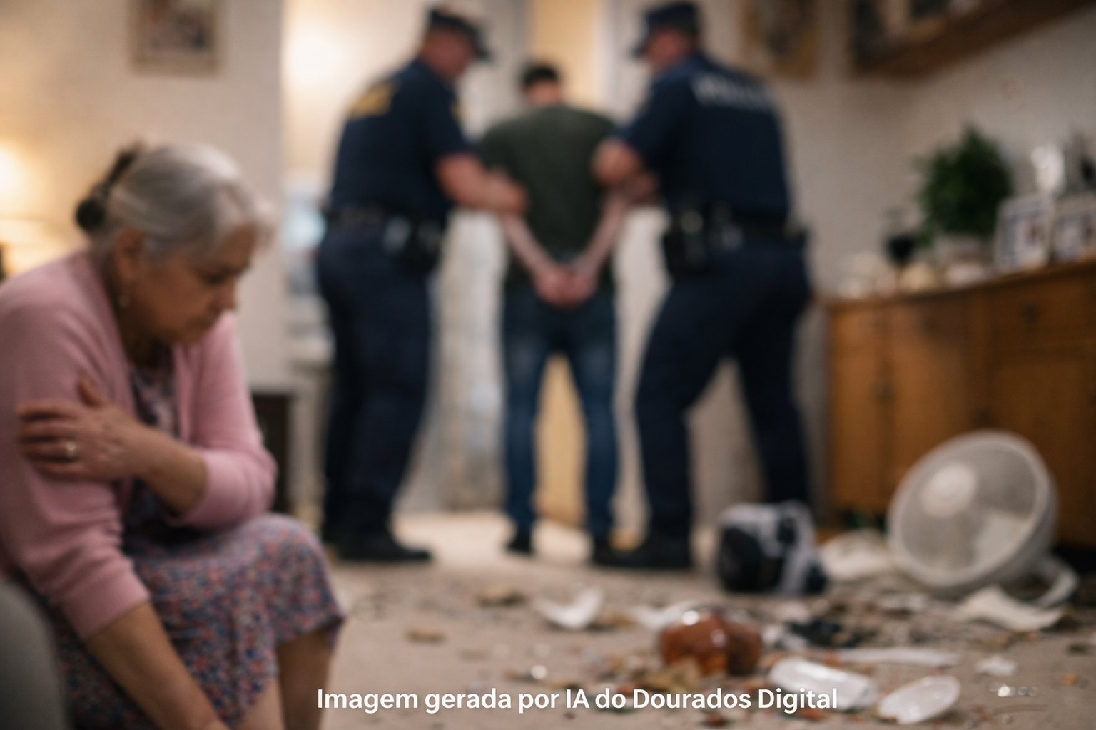 Segundo o boletim de ocorrência, o homem chegou de uma pescaria e passou a quebrar objetos da cozinha, como copos, além de danificar um ventilador e jogar itens no chão. Durante o ataque, ele apertou o braço da mãe e a derrubou.