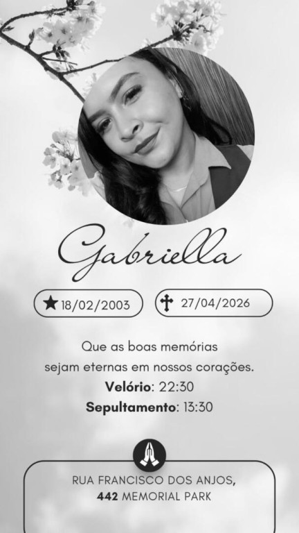 O velório da jovem inicia às 22h30 desta segunda-feira, no cemitério Memorial Park, e o sepultamento acontece às 13h30 desta terça-feira (28).
