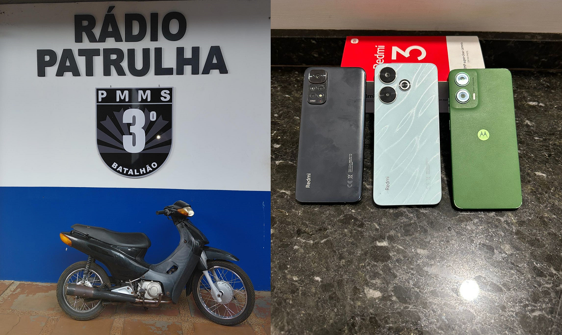Uma equipe do 3º Batalhão da Polícia Militar recuperou, na tarde desta segunda-feira (1º/12), uma motocicleta Honda Biz com registro de roubo ou furto e apreendeu três celulares — um deles identificado como produto de crime — no Parque das Nações I, em Dourados.