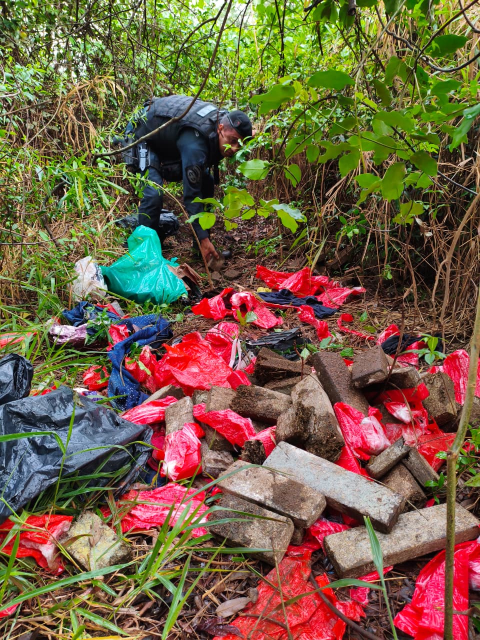 Ao chegarem ao local, próximo a um barracão de mecânica, os policiais localizaram diversos tabletes da substância análoga à maconha, que estavam abandonados em meio à vegetação.